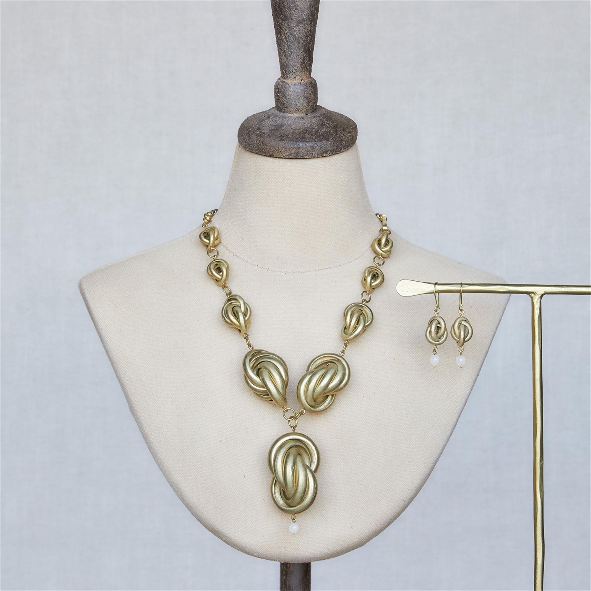 Concurrent circles of brass are linked together to form this fashionable jewelry collection. A faceted bead of white onyx finishes off the necklace.