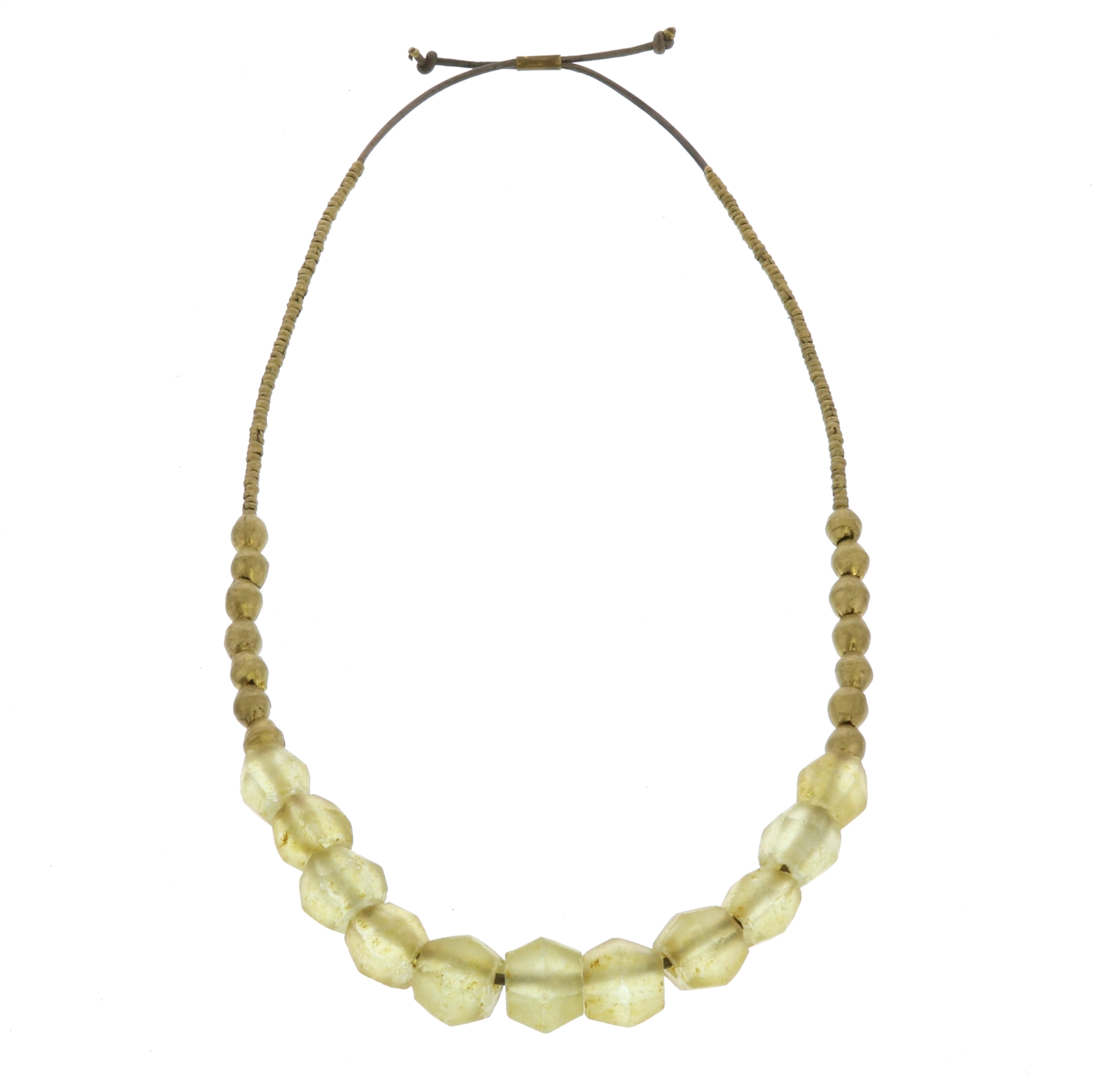 Matte, translucent seaglass beads are complimented perfectly by brass African beads in this layer-able and easy to wear collection. Adjustable soft leather cord. 10.5″ length
