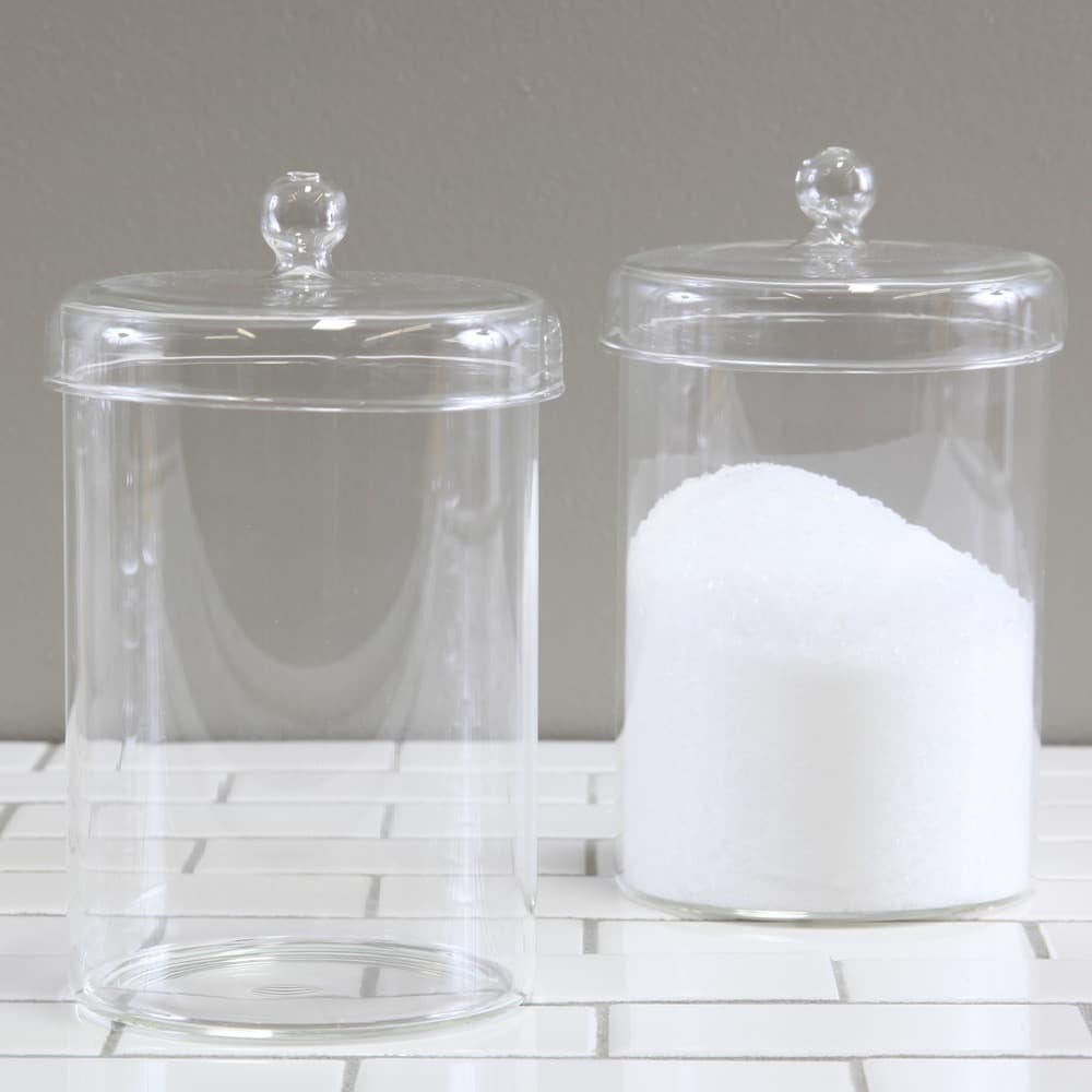 Utility Jars are stylish and versatile. They can be used in kitchen for dry goods and in the bathroom for cotton balls or bath salts. The utility Jars include stoppers but are not air tight. Hand washing is recommended.