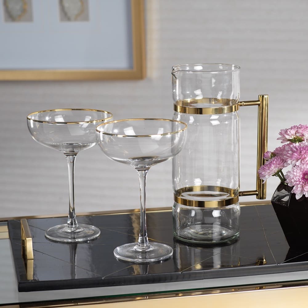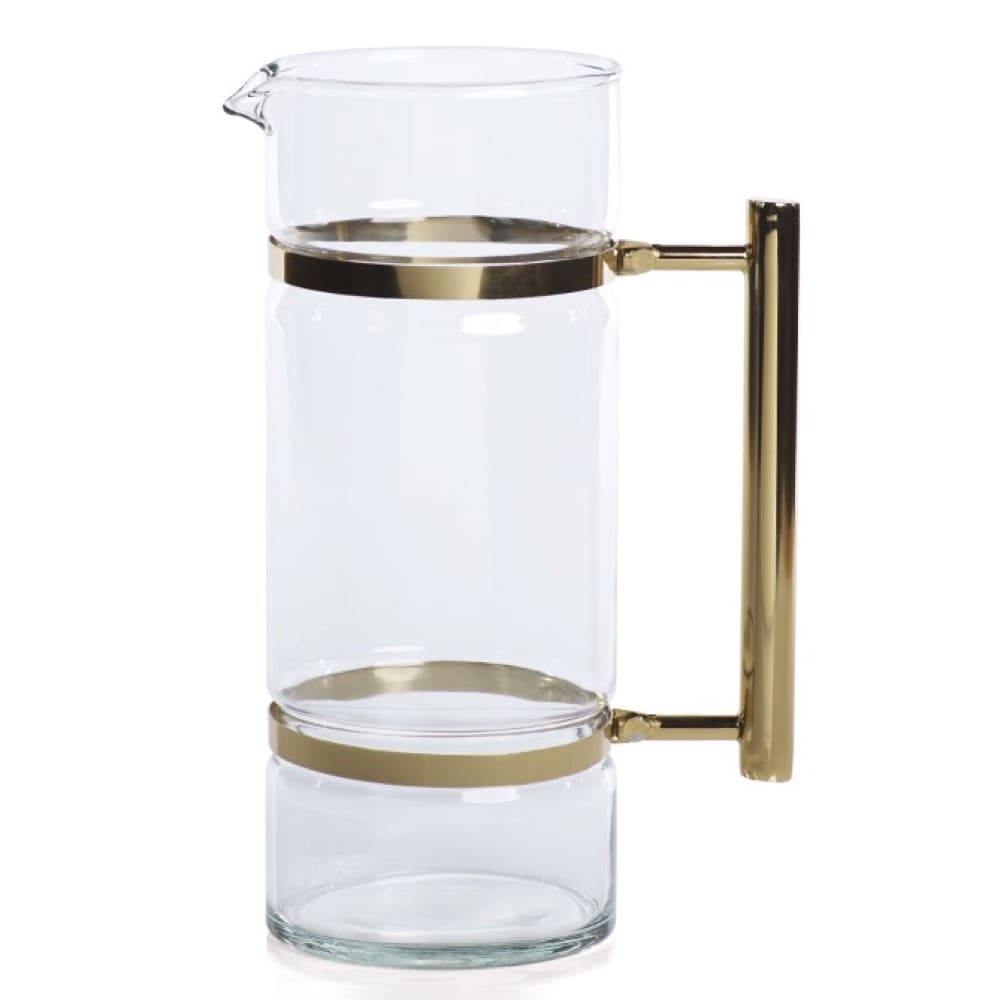 The beautiful glass pitcher is a great looking pitcher to serve up any of your favorite drinks to your guests. The double iron band in gold finish around the pitcher connecting to the handle adds style that will make this beautiful pitcher a favorite treasure in your kitchen.