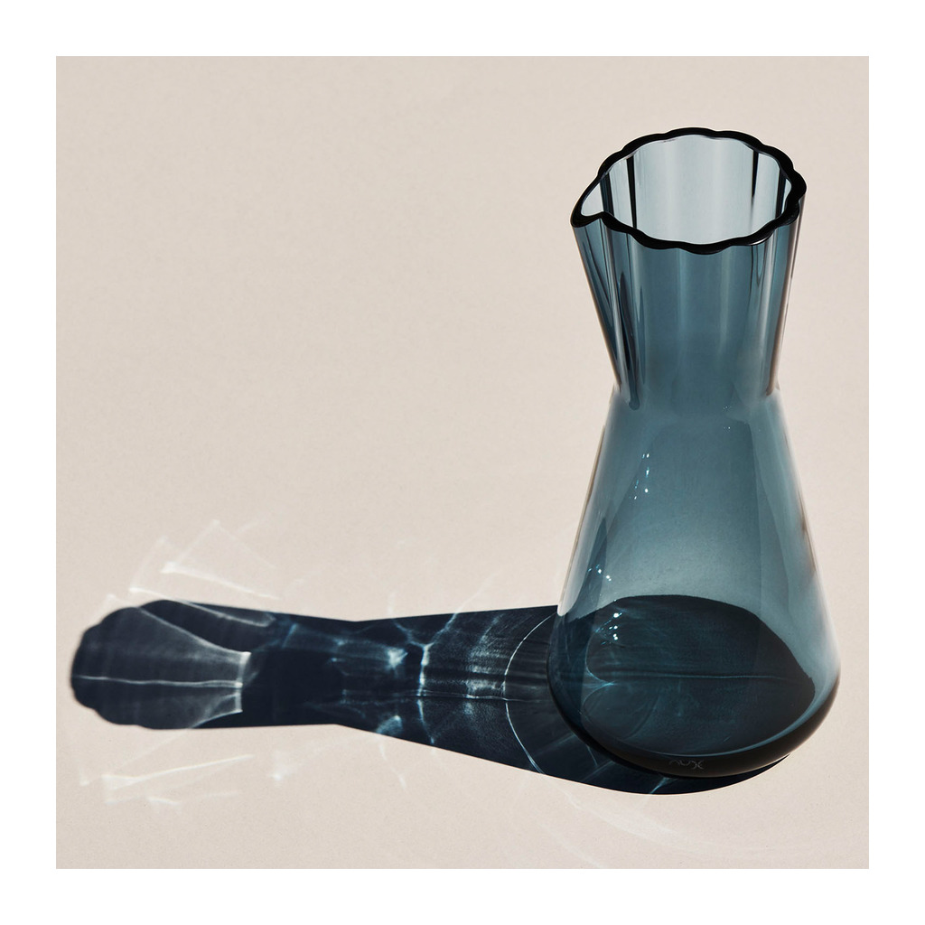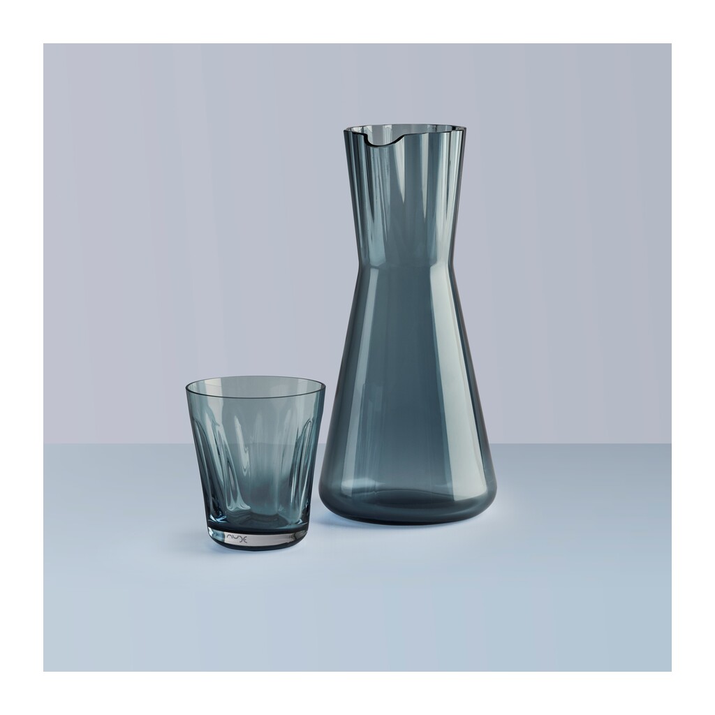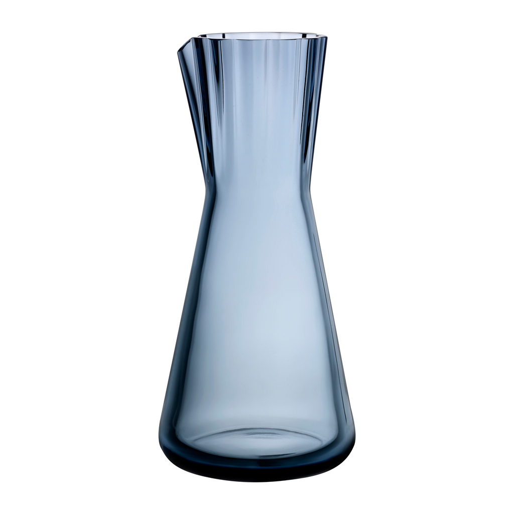 The Lady water carafe by NUDE offers a unique contrast of sharp, clean lines alongside the soft fragility of fine crystalline glass. Rendered in an evocative steel blue hue, the design boasts a sleek, modern silhouette and an intricate pleated motif adorning the rim. Made in Turkey.