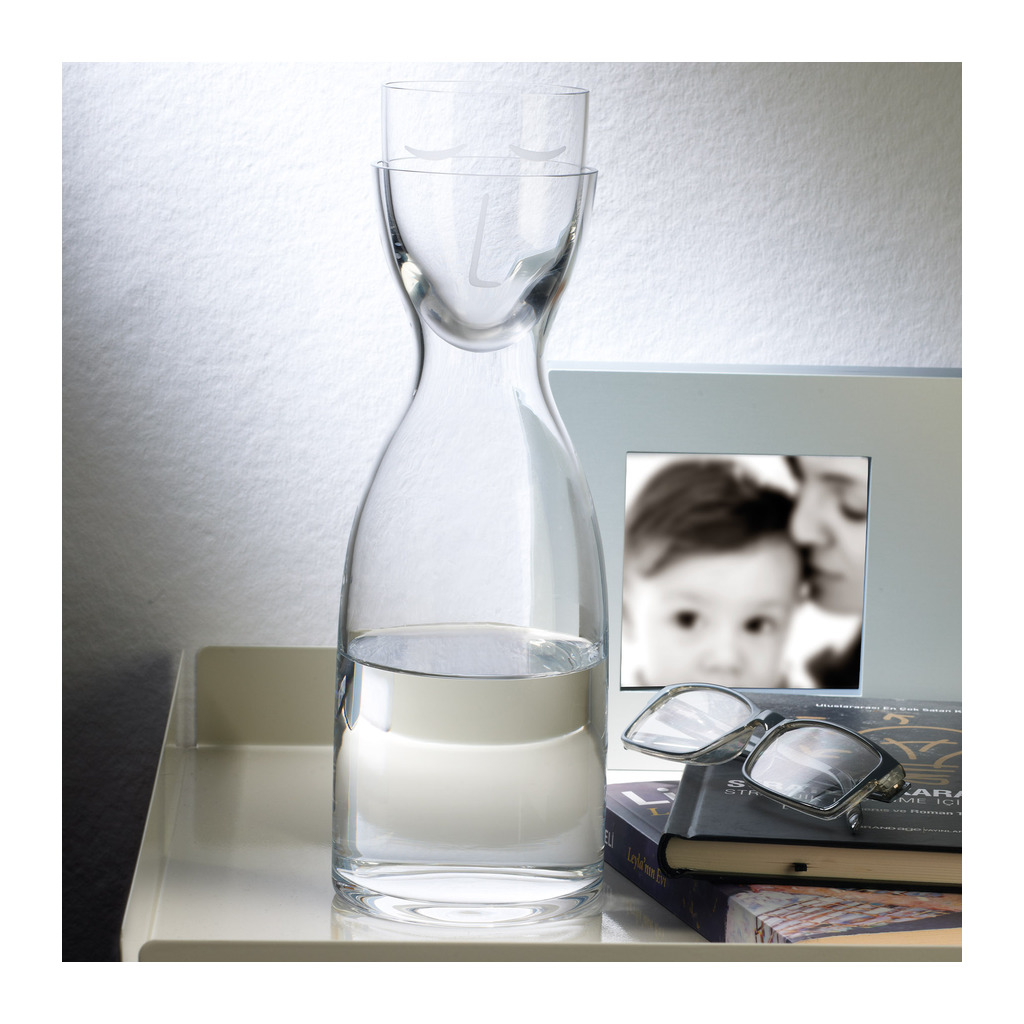 The Mr.&Mrs. range by NUDE is characterised by a light, playful personality and this bedside water set is no exception. Crafted from mouth-blown, clear crystalline glass, the tall carafe is crowned with a matching cup adorned with a sleeping face motif. The beautifully minimal, tall silhouette will stand out in any setting. Made in Turkey