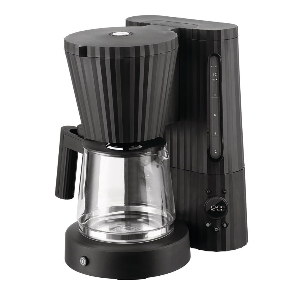 Start your day with aesthetically pleasing Plisse Collection Drip Coffee Maker by Alessi. The filter coffee machine designed by Michele de Lucchi takes shape in an interplay of elegant pleated volumes to accompany everyday breaks with its now distinctive design inspired by the finest tailoring. Removable filter holder and filter with measuring scale, made of polypropylene and mesh, and pyrex measuring jug. Time display allows to easily set time and “Auto On” for the perfect cup of coffee at just the right time.