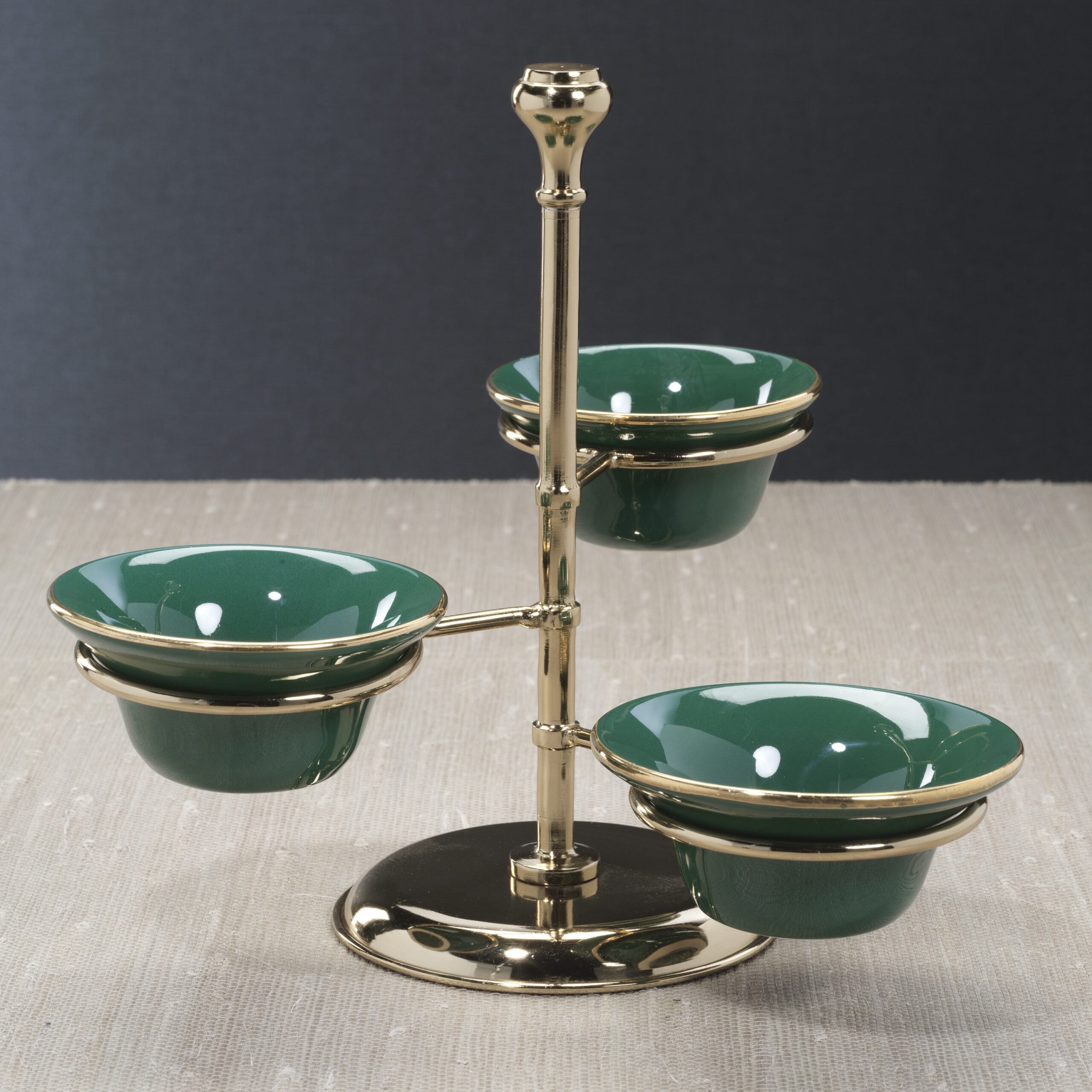 A luxurious addition to any tablescape, the Monte Napoleone 3-Tier Condiment Bowl Set combines practicality with elevated style. Three removable green ceramic bowls sit atop a polished gold stainless steel stand, making serving and refilling effortless. The top of the stand features a convenient knob for easy transport, while gold accents around the rims of the bowls provide an opulent finishing touch.