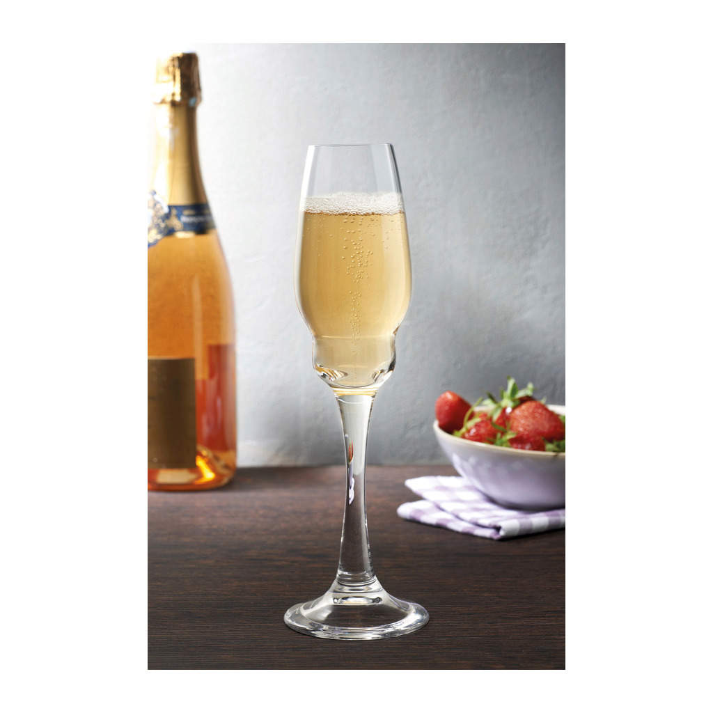Made from fine lead-free crystal, the Heads Up set of champagne glasses brings the traditional material into the now. Created in collaboration with an English architect and multidisciplinary designer, Nigel Coates, notice the expertly moulded double curve detail which adds a tactile edge to the streamlined shape. Made in Turkey
