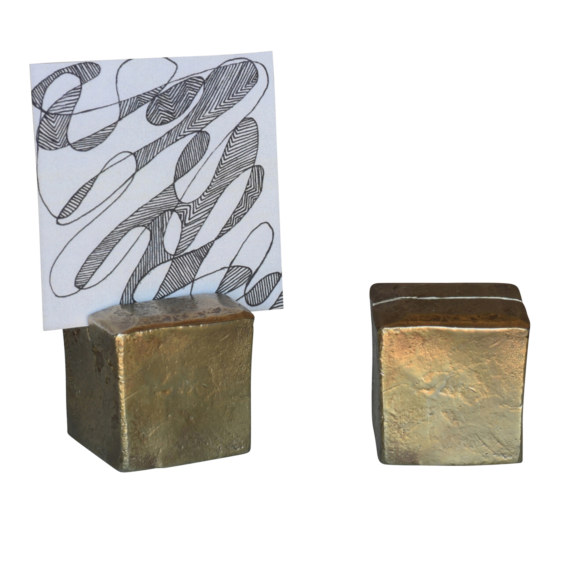 Cast of iron with a chiseled texture and brass plating. Our place card holders are a beautiful addition to a table scape, or a sweetly simple way to display a photograph or business card.