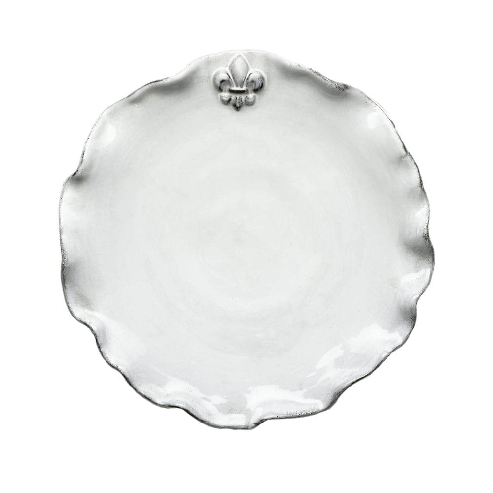 A handmade ruffled edge plate with Fleur de Lis symbol and white washed glaze finish. Practical yet charming. Made in Italy, the entire Fleur De Lis Collection is a best seller. Sold as Set of 4.