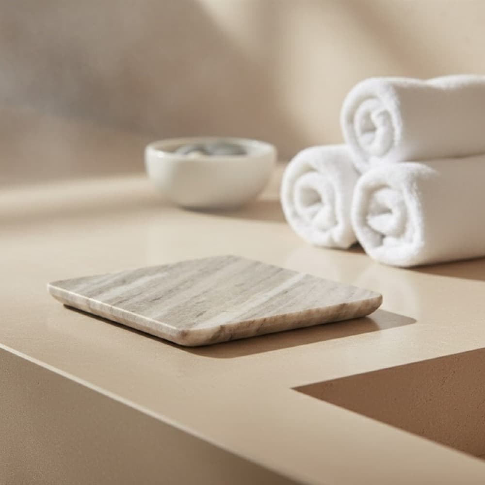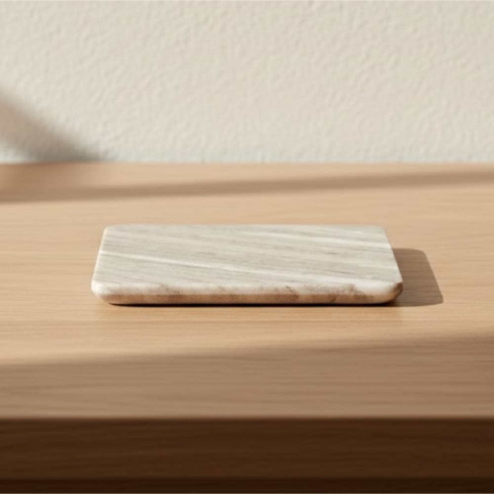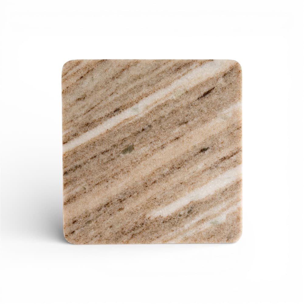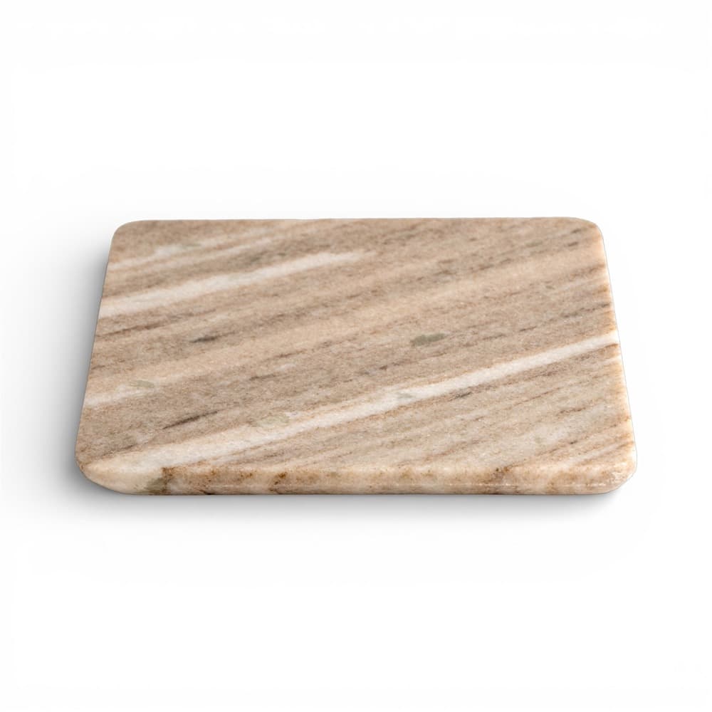 This small square marble platter measures **8″ × 8″** and is crafted from elegant beige marble with natural veining. Its smooth, polished surface brings a refined, timeless look to any table setting. Perfect for serving appetizers, cheeses, or desserts, it also works beautifully as a base for candles or décor. Durable yet stylish, it adds a touch of luxurious sophistication to everyday entertaining.