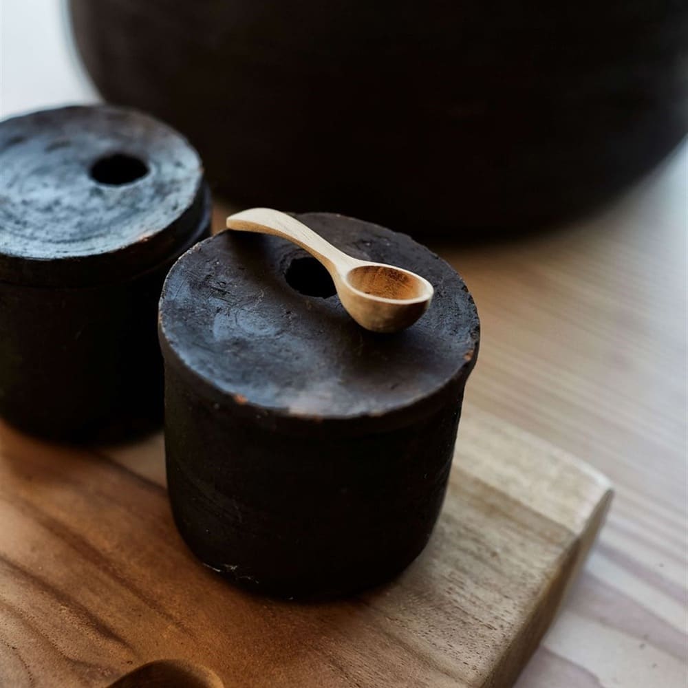 Minimalistic salt and pepper set from Muubs with lid. The Hazel set is handmade in terracotta, and then burned over the bonfire, giving each set a unique colour. The set has a perfect size for standing on the table. Since they also have a warm and organic look, they will dress your table setting. Before you use the set it is recommended that you rub each product, into cooking oil and put it in a medium warm oven for 30 minutes. The natural terracotta bowls must be cleaned with hot water and soap. Dishwasher is not recommended. Food Safe. Spoons sold separately.