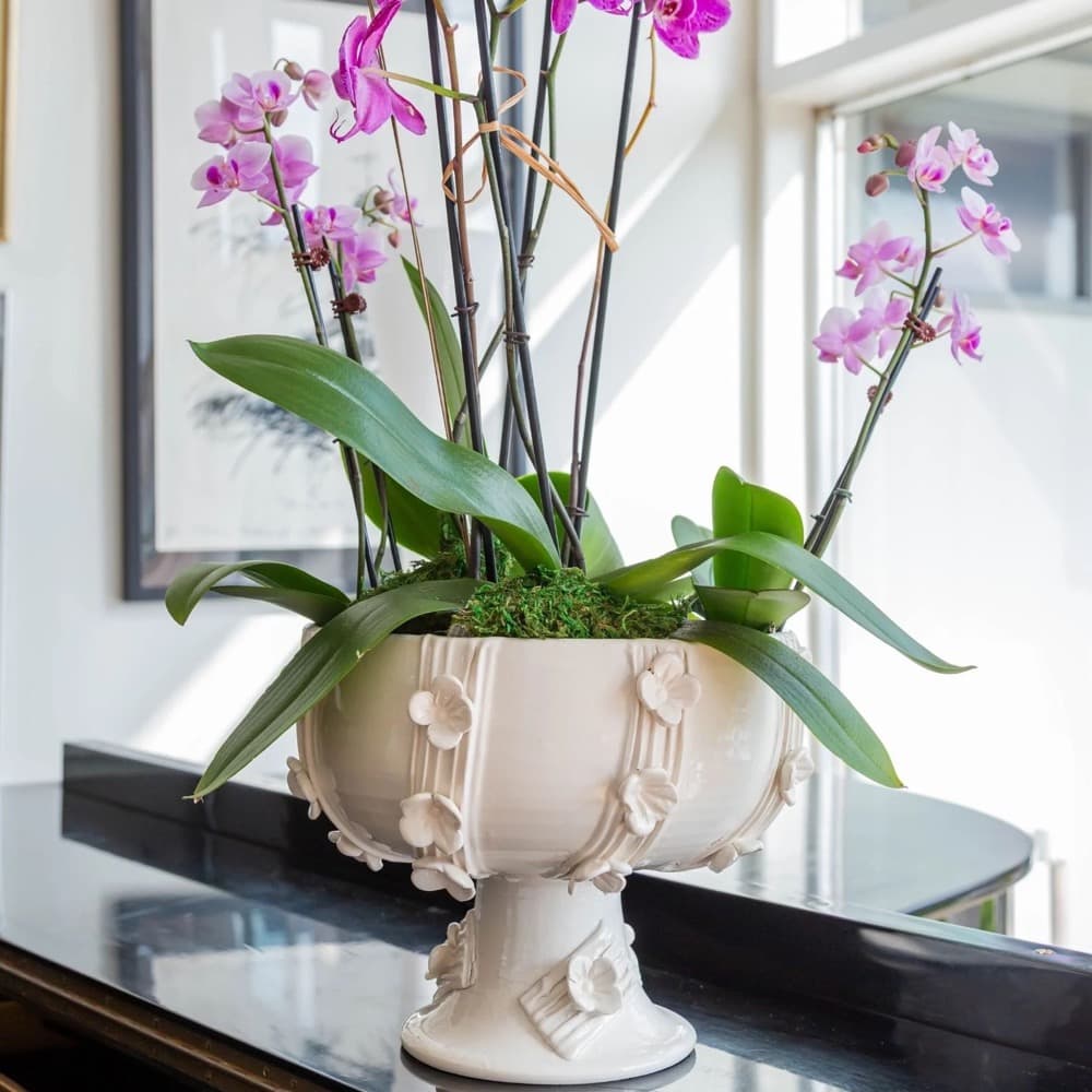 Our new wildflower collection is a lovely grouping of vessels.  Each piece is adorned with hand applied flowers.  Handmade in Italy.