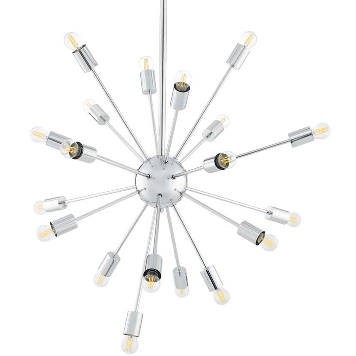 Release an impressive array of twenty-four beams of light with the Volley chandelier. Designed to convey bursts of energy while illuminating your kitchen, living or dining room, Volley is an inspiring mid-century modern ceiling pendant made of chrome plated metal that fits twenty-four E12 25W bulbs (not included) and comes with a 39” adjustable wire cord.