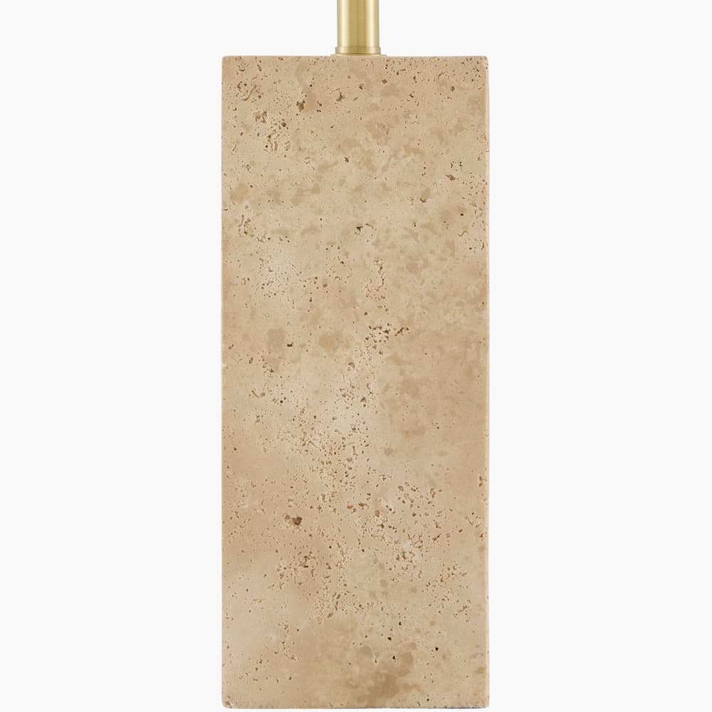 Materials: Body: Travertine; Shade (Outside): Linen; Shade (Inside): Polystyrene; Finial: Iron