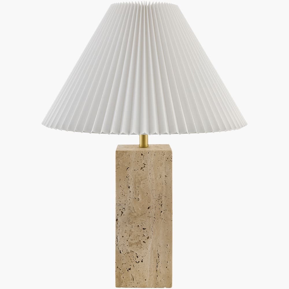 Designed by Galey Alix for Livabliss, the Autumn Laurel collection features solid travertine bases and trendy pleated linen shades. These lamps combine the textures of natural stone and classic linen. Their neutral color palette ensures they fit in any space, while their unique look ensures they add visual interest.