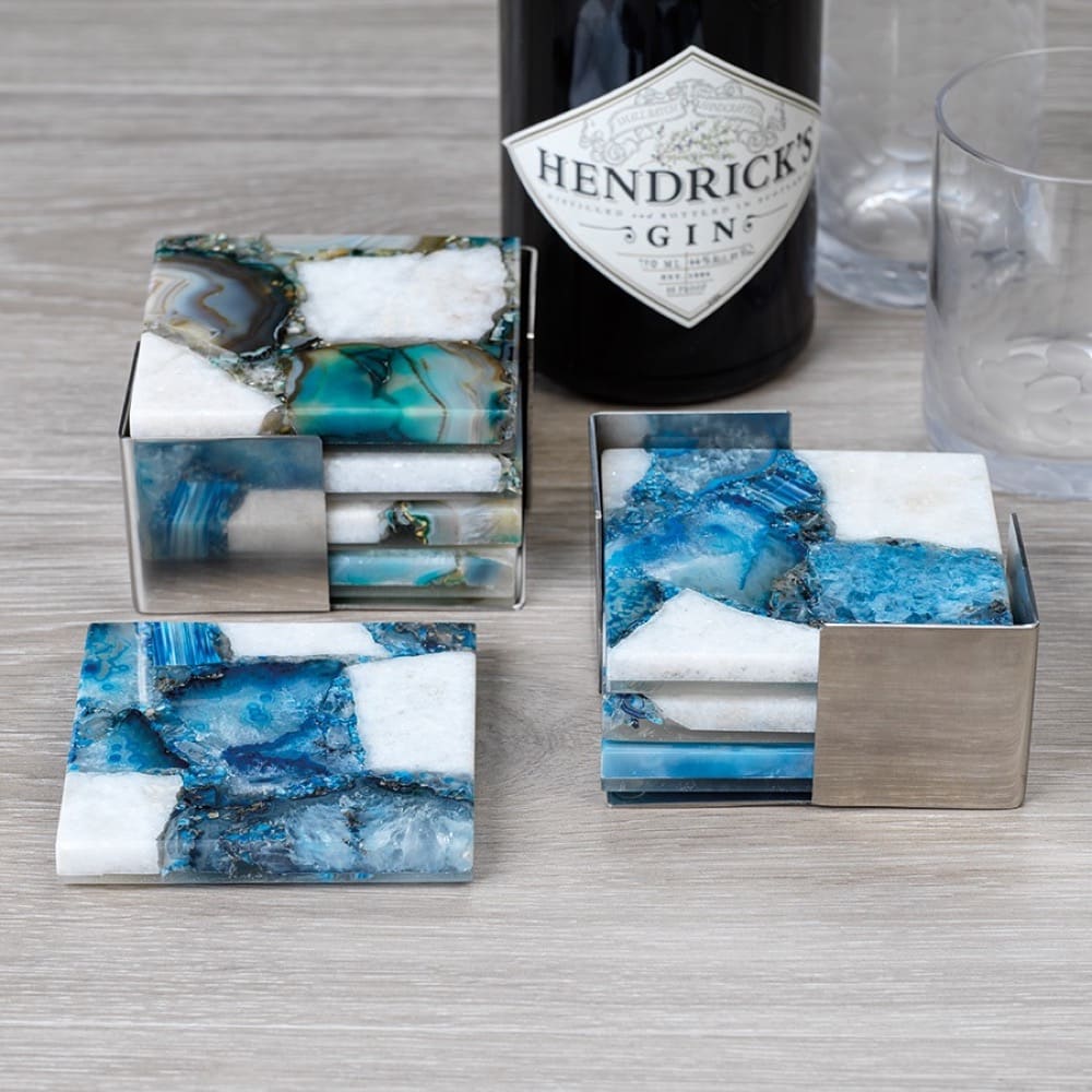 Your home should be accessorized as thoughtfully as your outfit. Our 4-set of agate coasters are an instant conversation starter at any cocktail party. This 4-piece coaster set is just the lovely and artful thing to keep your tabletop or bar safe from condensation rings. This set is perfectly at home in modern aesthetics. It also makes an eye-catching and thoughtful housewarming gift for friends and family.