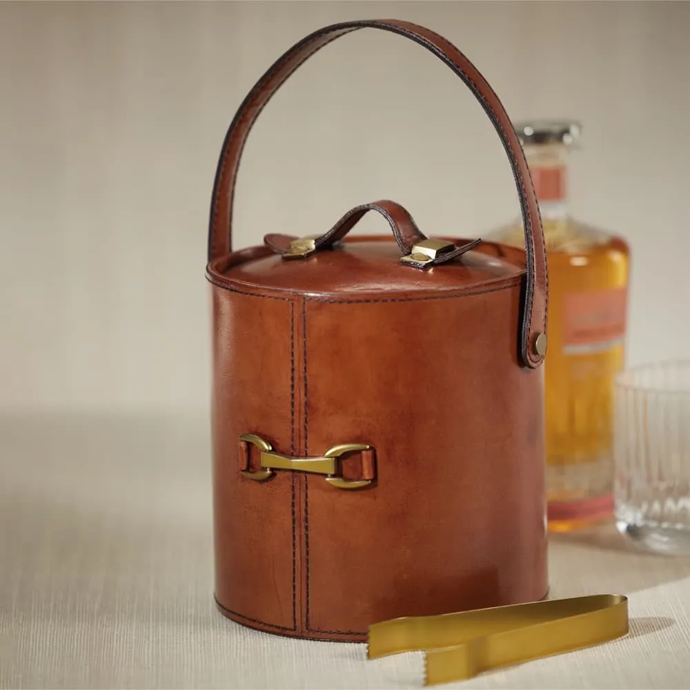 Our Chadwell Leather Ice Bucket features a solid construction lovely tan leather with bold stitching that pairs well with transitional decor. It contains a removable stainless steel ice container for easy hand washing. Comes with a thick, durable leather handle for easy portability and matching ice tongs. Wipe clean with soft cloth for the leather covering.