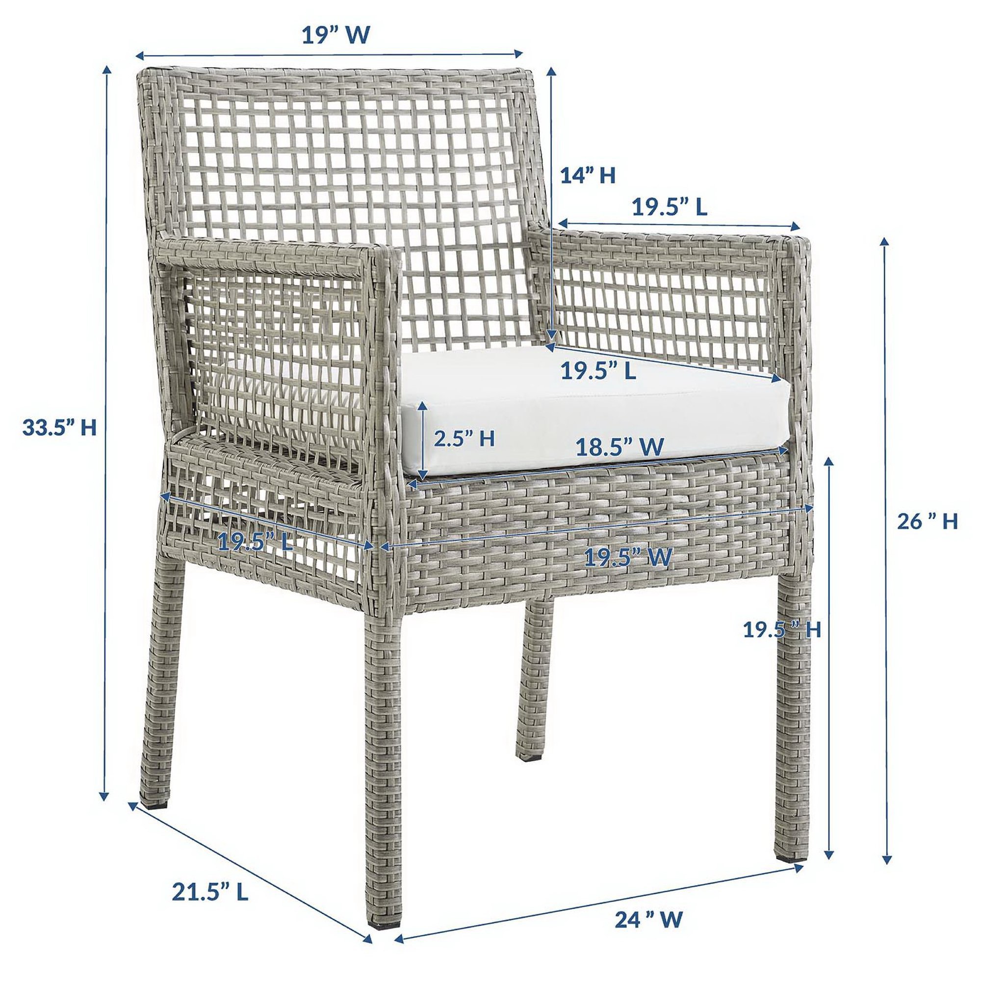 Weave conversational threads into a rollicking good time with Aura Outdoor Patio Dining Arm Chair. Aura is an outdoor dining chair that comes with a synthetic gray-on-gray tone wicker rattan weave and a powder-coated aluminum frame that delivers a softly versatile outdoor collection that shifts to meet the needs of the moment. Outfitted with a machine washable and fade resistant all-weather fabric cushion, Aura Patio Dining Chair will make your outdoor spot the focal point of good memories and festive gatherings while enhancing your patio, backyard or poolside arena. Complete with non-marking foot caps, enjoy spacious seating and enhanced comfort with this reliable piece of outdoor furniture.