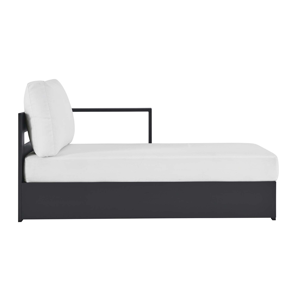 Enliven your alfresco spaces with the Tahoe Aluminum Outdoor Patio Right-Facing Chaise Lounge. This modern lounge chair is constructed with well-crafted, durable powder-coated aluminum, dispensing contemporary elegance in your outdoor lounge spaces. Its dense foam padding ensures sustained comfort, making it ideal for poolside lounging or as an outdoor patio sunbed, complete with a UV and water-resistant fabric-covered seat and backrest. The cushion covers are removable for easy machine washing. Part of a modular outdoor furniture collection, this right-facing sofa chair features a sturdy armrest on one side and an open end on the other, making it ideal for pairing with its matching sectional piece or versatile positioning with other outdoor furniture. The entire Tahoe aluminum patio furniture set features non-marking foot glides to protect your deck or patio floor and comes with easy-to-follow assembly instructions. Weight Capacity: 661 lbs.