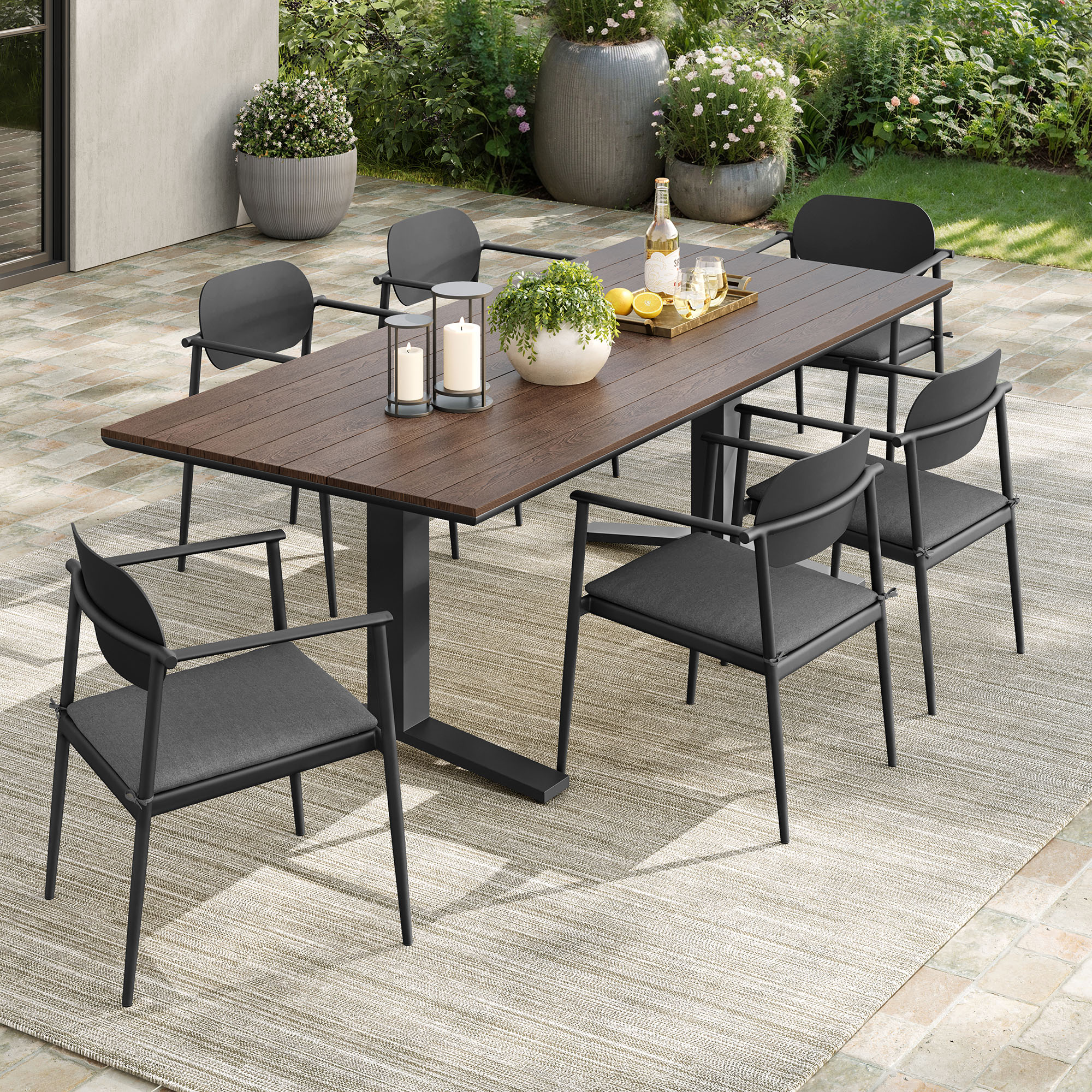 Create a chic outdoor dining experience with the modern Aeris 7-Piece Patio Dining Set. This complete outdoor dining set features a slatted faux wood rectangle table and six stackable patio chairs. Both the 91″ patio table and chairs are crafted with powder-coated aluminum that offers durability and contemporary style, perfect for withstanding all weather conditions. The table showcases a unique T-shaped base, while each chair includes a gently sloped seat with an oblong backrest for ergonomic comfort. The chairs are also equipped with removable foam-padded seats, and water and UV-resistant fabric covers. Beneath each cushion, the chair’s open slat design promotes breathability and quick drying. With adjustable foot pins on the table and non-marking foot pads on the chairs, the entire aluminum outdoor dining set is thoughtfully designed to protect your patio floors. Whether for casual family meals or spontaneous gatherings, the Aeris Aluminum Dining Set is the perfect modern patio dining set for 6. Assembly required.