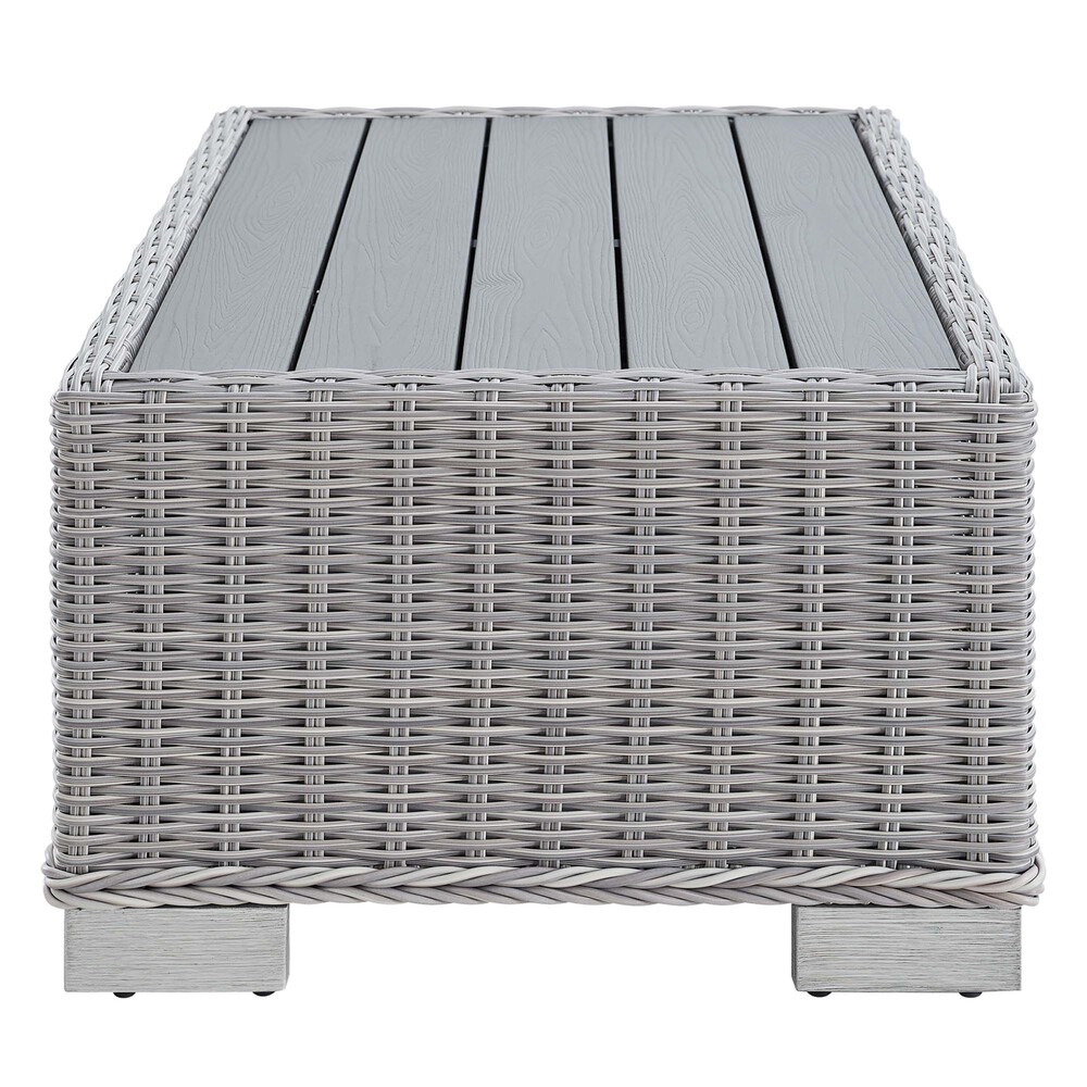 Enjoy fresh air and alfresco relaxation with the Conway Outdoor Patio Wicker Rattan 4-Piece Furniture Set. Wrapped in UV-resistant light gray synthetic wicker rattan, this patio furniture set boasts organic texture and a neutral hue that brings a calming presence to your outdoor space. The frames of this outdoor furniture set are crafted with durable powder-coated aluminum and rest on L-shaped legs with plastic foot glides. Thick foam padded cushions covered with removable, all-weather polyester fabric covers offer a comfortable seat and affix securely to the lounge chair with cord tension attachments. Trending aesthetics and a classic design define this outdoor patio furniture collection making it a beautiful addition to any outdoor space including the backyard, patio, porch, balcony, or poolside. Assembly required. Set Includes: Sofa, Loveseat, Armchair, Coffee Table