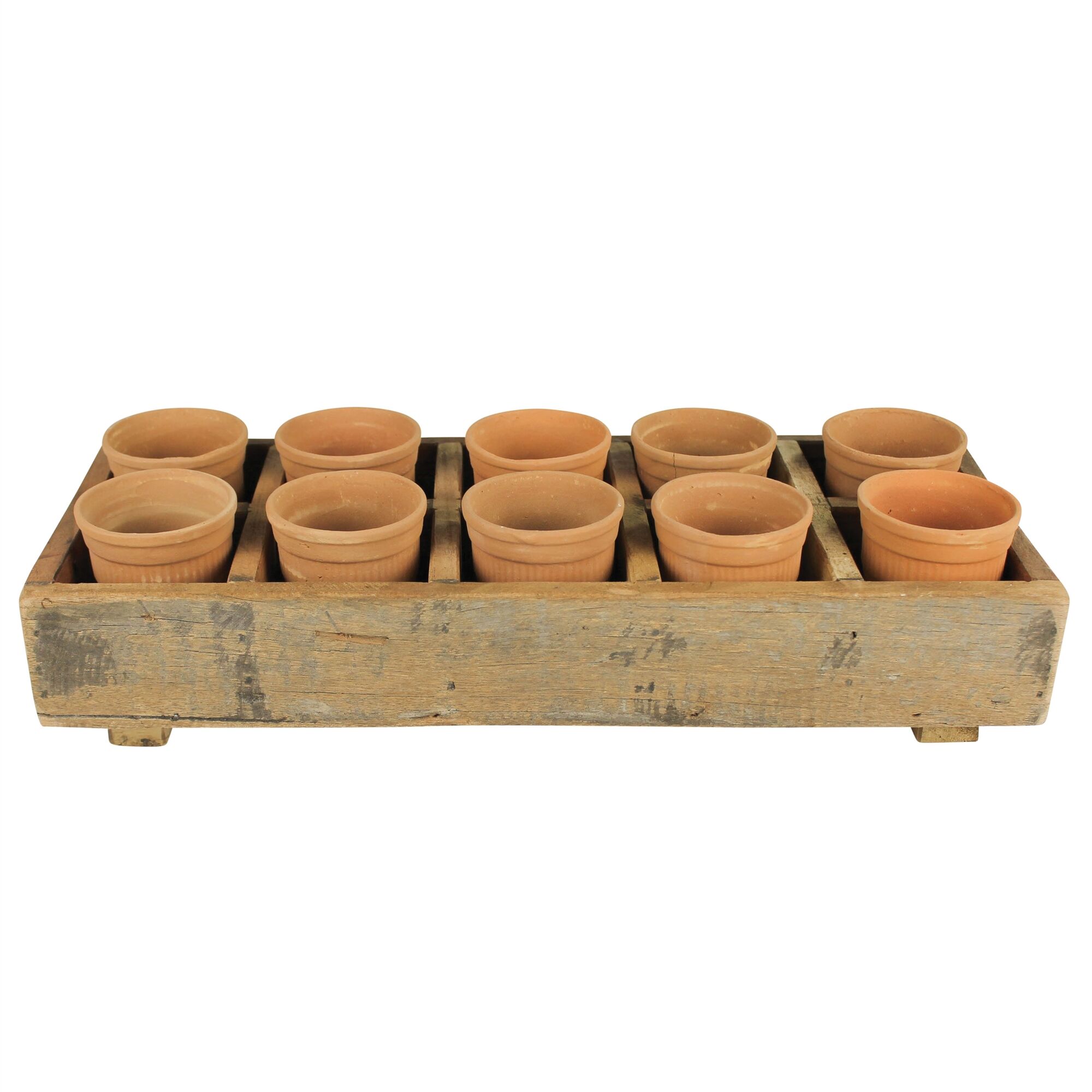 A rustic wood caddy with 10 terra cotta cups creates a multi-purpose vessel for tiny planted pots, garden treasures or other bits and bobs.